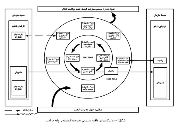 مطالعات زیست محیطی و سامانه اطلاعات مکانیاستاندارد بينالمللي ISO 9004:2009 در راستاي كمك به سازمانهايي كه قصد دارند از طريق پياده سازي استاندارد ISO 9001:2008 به موفقيت پايدار دست يابند، طراحي شده و تلاش دارد از طريق تمركز بر روي نيازها و انتظارات كلية ذينفعان در بلند مدت و بصورت متوازن – كه لازمه موفقيت پايدار است – سازمانها را در بهبود مداوم و نظاممند عملكرد خود، ياري رساند. شكل زير مدل گسترش يافته سيستم مديريت كيفيت بر پايه فرايند را نشان ميدهد و به عناصر استانداردهاي 9001 و 9004 اشاره مي نمايد.